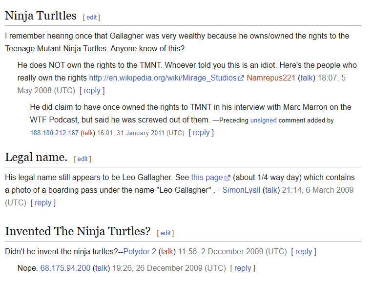 From the "Talk" section of Wikipedia, where editors discuss their pages:
