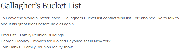One of the entries in Poems is a Bucket List, written in a manor you could only really decode if you were Gallagher or are as diseased as I am. Here are the intro and first few entries: