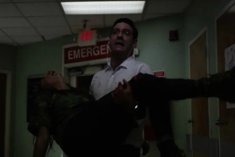 Benjamin's segment ends with its central character running onto a road for help and immediately getting hit by Lucas, a driver played by the great Mather Zickel (you may recognize him from a bunch of David Wain projects or Newsreaders; in The Ten, he plays the newscaster who gets cuckolded by a ventriloquist's dummy). That's the beginning of "The Accident"– a woman is hit by a car and the guy who hits her, who is initially on the phone with his wife, dials 911.