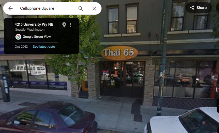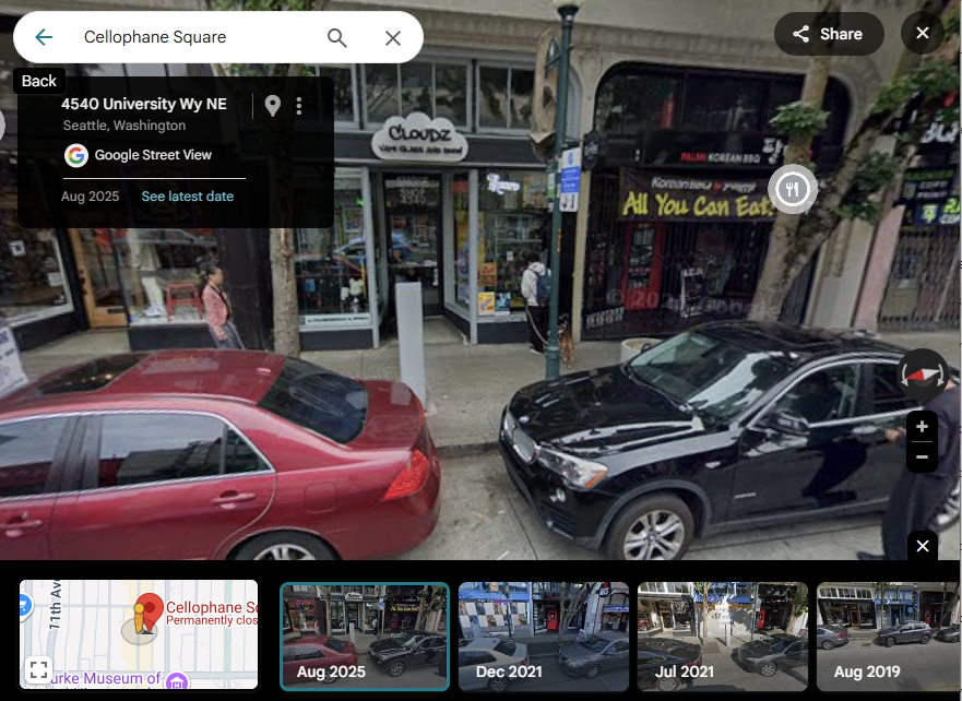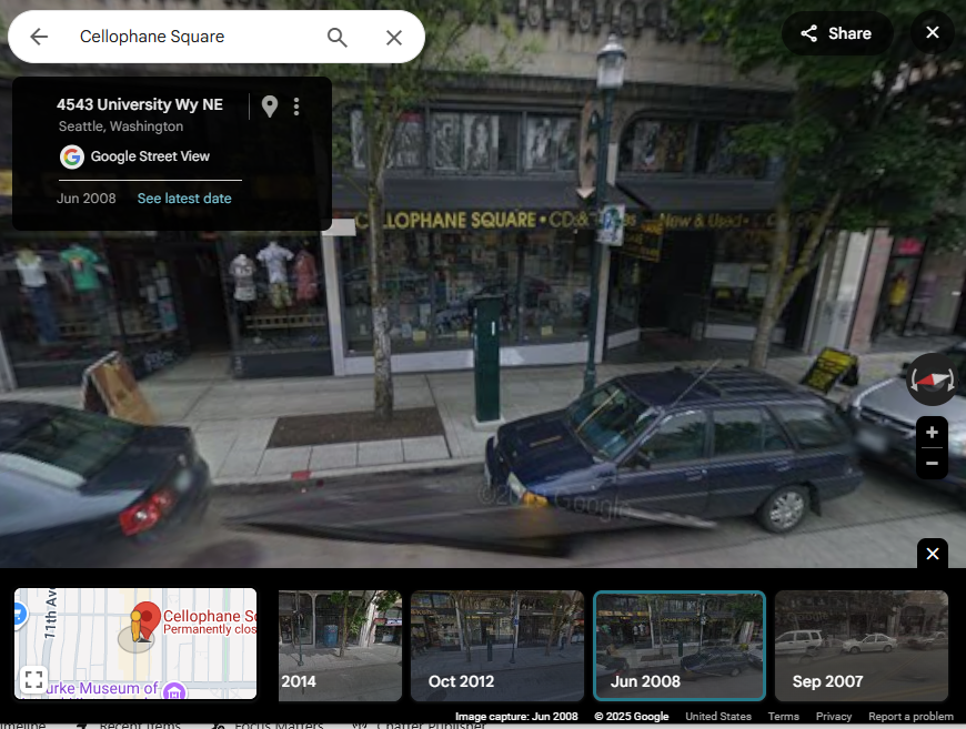 I've been thinking more about Seattle recently, primarily because of a post I wrote a week or two ago about The Jesus Lizard. Here's a June 2008 Google Street View shot of Cellophane Square, the record store near the University of Washington where I bought Jesus Lizard CDs: